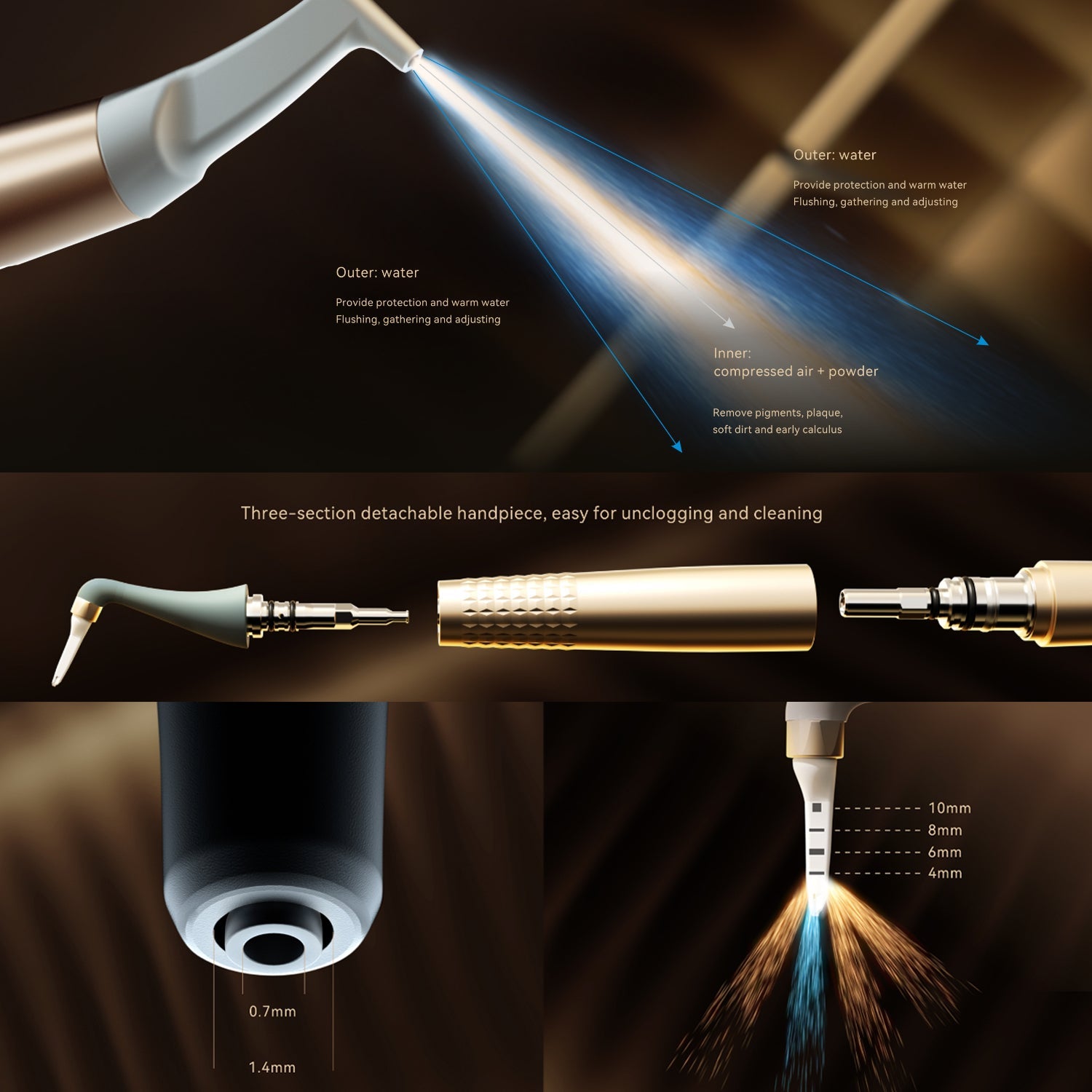 L'embout sous-gingival en polymères médicaux peut pivoter à 360' et se plier.