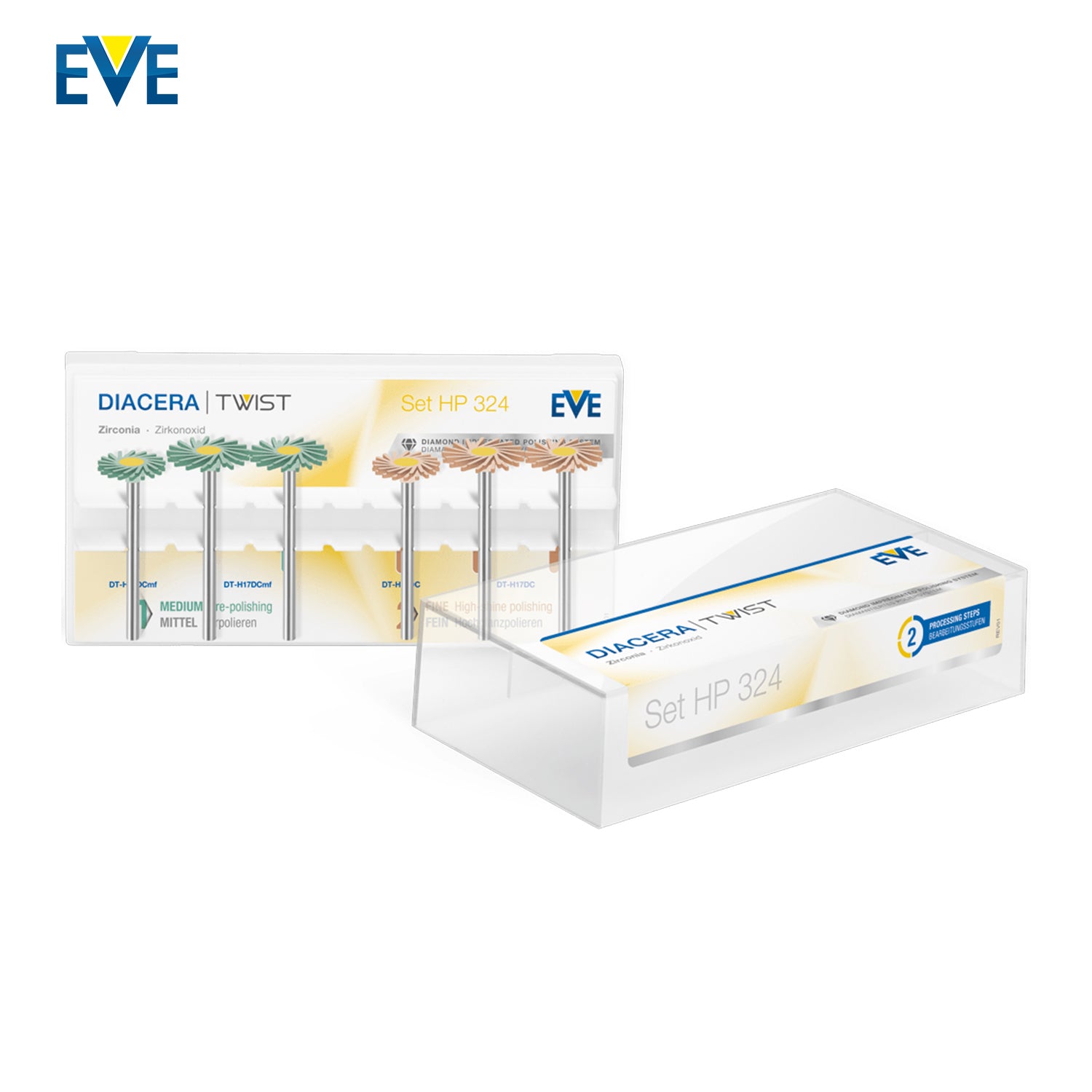 EVE Diacera polishing rubbers are diamond-infused tools compatible with contra-angle handpieces, specifically designed for zirconium oxide. The low-speed operation, combined with special diamond particles, minimizes heat generation. These rubbers polish sintered zirconia to a glaze-like finish and are highly durable for extended use.