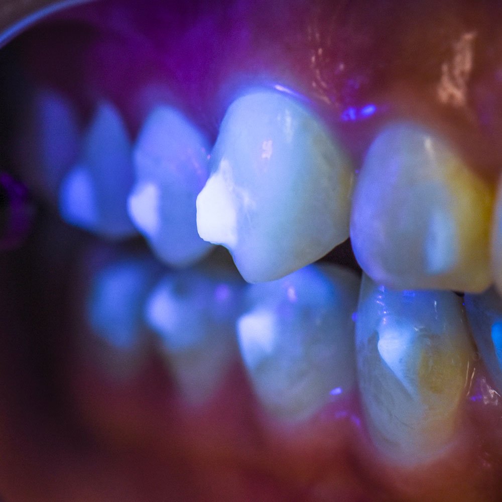 Modern dental composites and adhesives contain fluorophores which help in producing better aesthetic results. This gives them a fluorescent property.